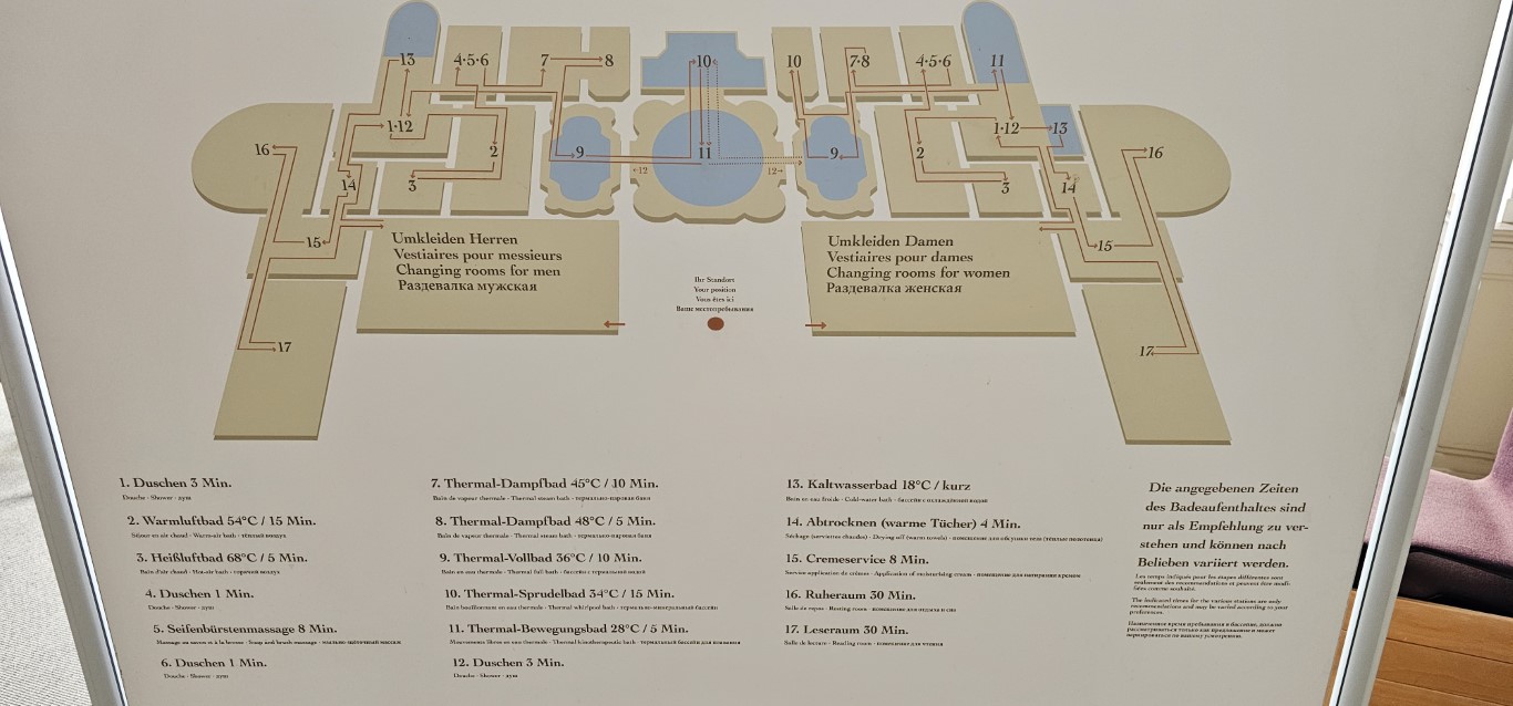 Caracalla Spa is more modern, and allows a more family experience of bathing, brine & steam rooms in the non-textile-free area.