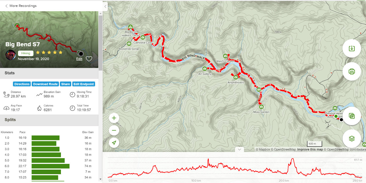 The main gorge walk is a 23km “out & back” hike, but add in the 8 or so side attractions, and that walk becomes ~29km+.
