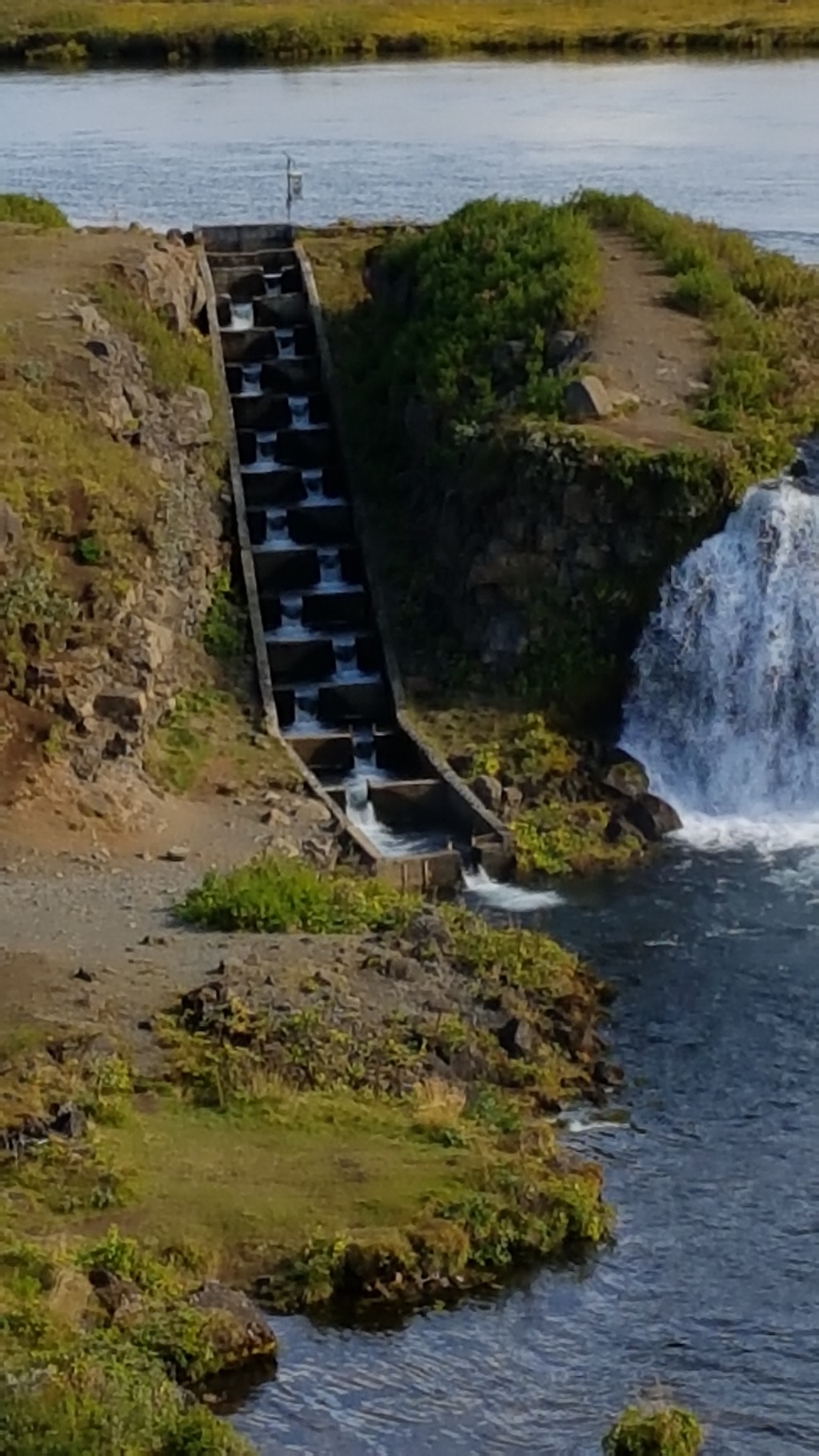 Turn off the access road and you will find the carpark within a minute. Get out of the car, and there it is in front of you ! You can drive or walk down further to the falls, and these are different as the left side of the falls has a “salmon ladder”, a series of human made water steps for the salmon to use to get upstream.
