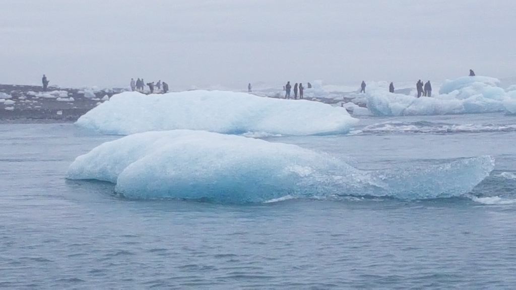 You will find numerous bergs there, grounded on the beach, able to be walked up to and touched. You will likely also witness bergs floating out to see in the rapid current. Between those bergs, were a few playful seals, popping up and down in the current.