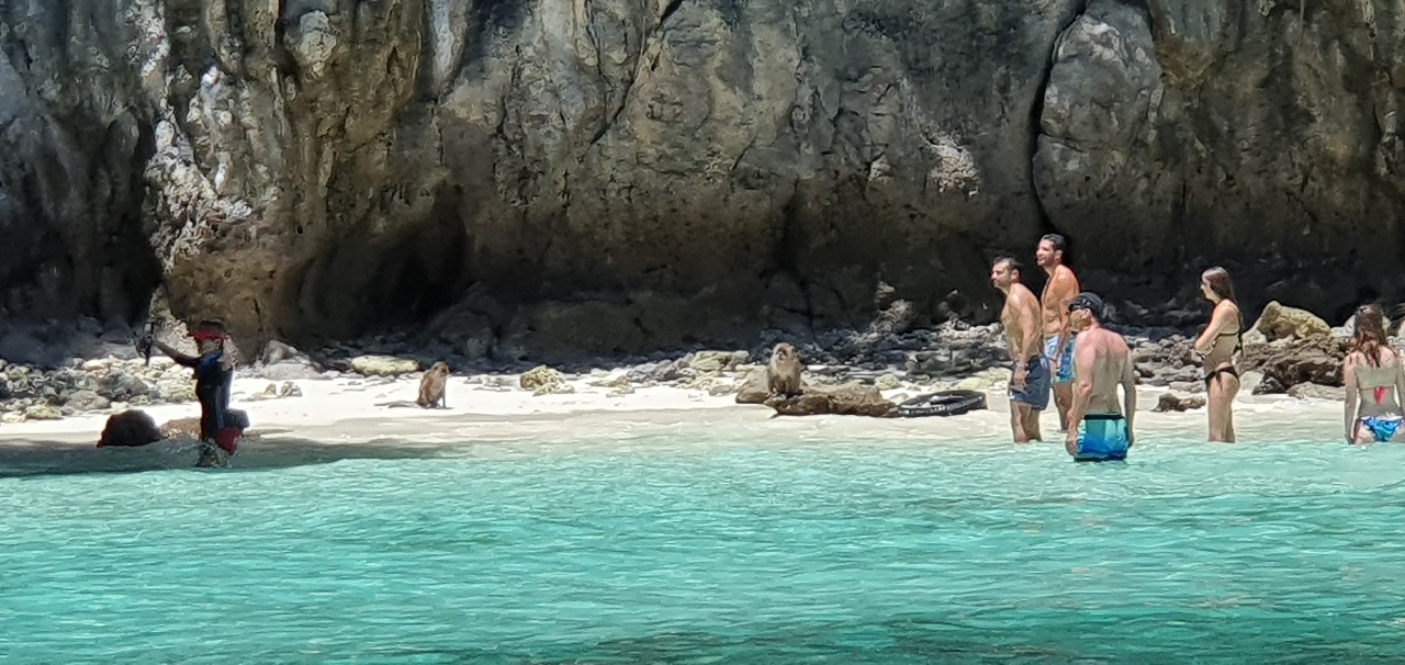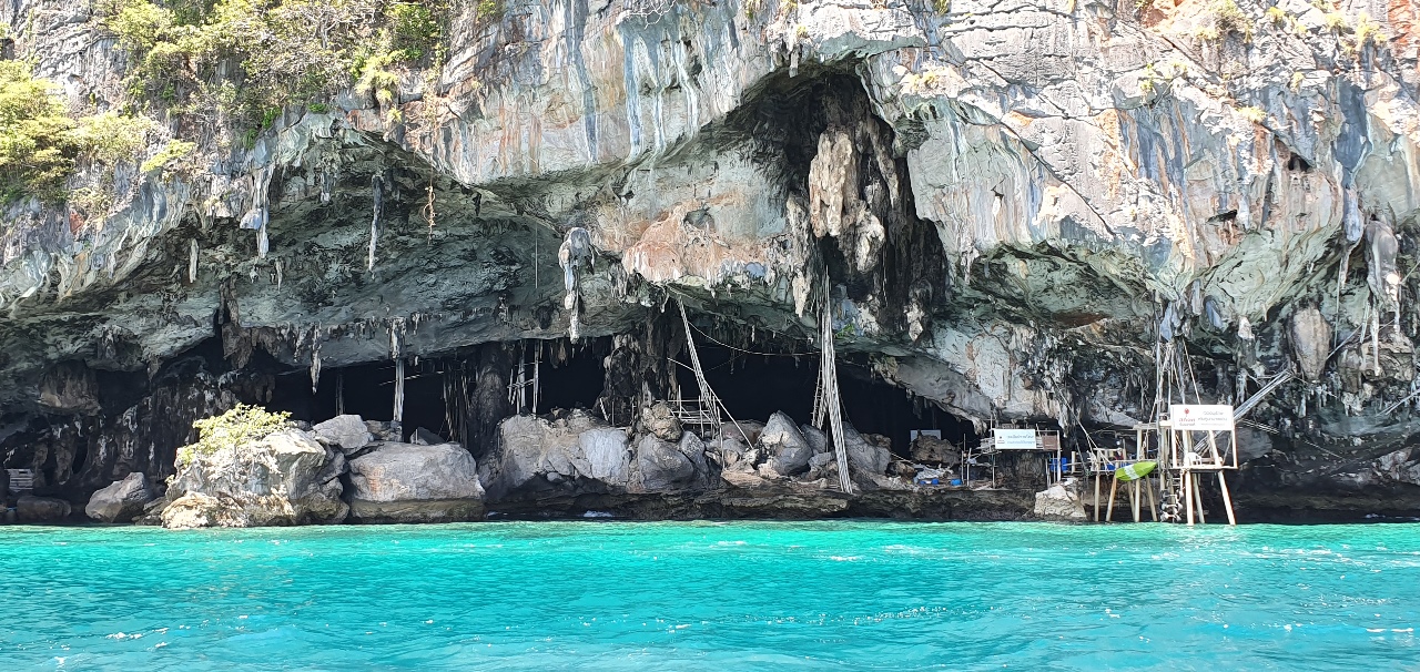 Simba’s Sunrise Tour left at 6am, and included breakfast at Bamboo Island with snorkeling there, the photo op to Maya Bay’s The Beach, snorkeling at Loh Samah Bay, swimming at Pileh Lagoon, visits to Monkey Beach & Viking Cave (photos below) then off for a lunch closer to the mainland at Rang Yai Island.