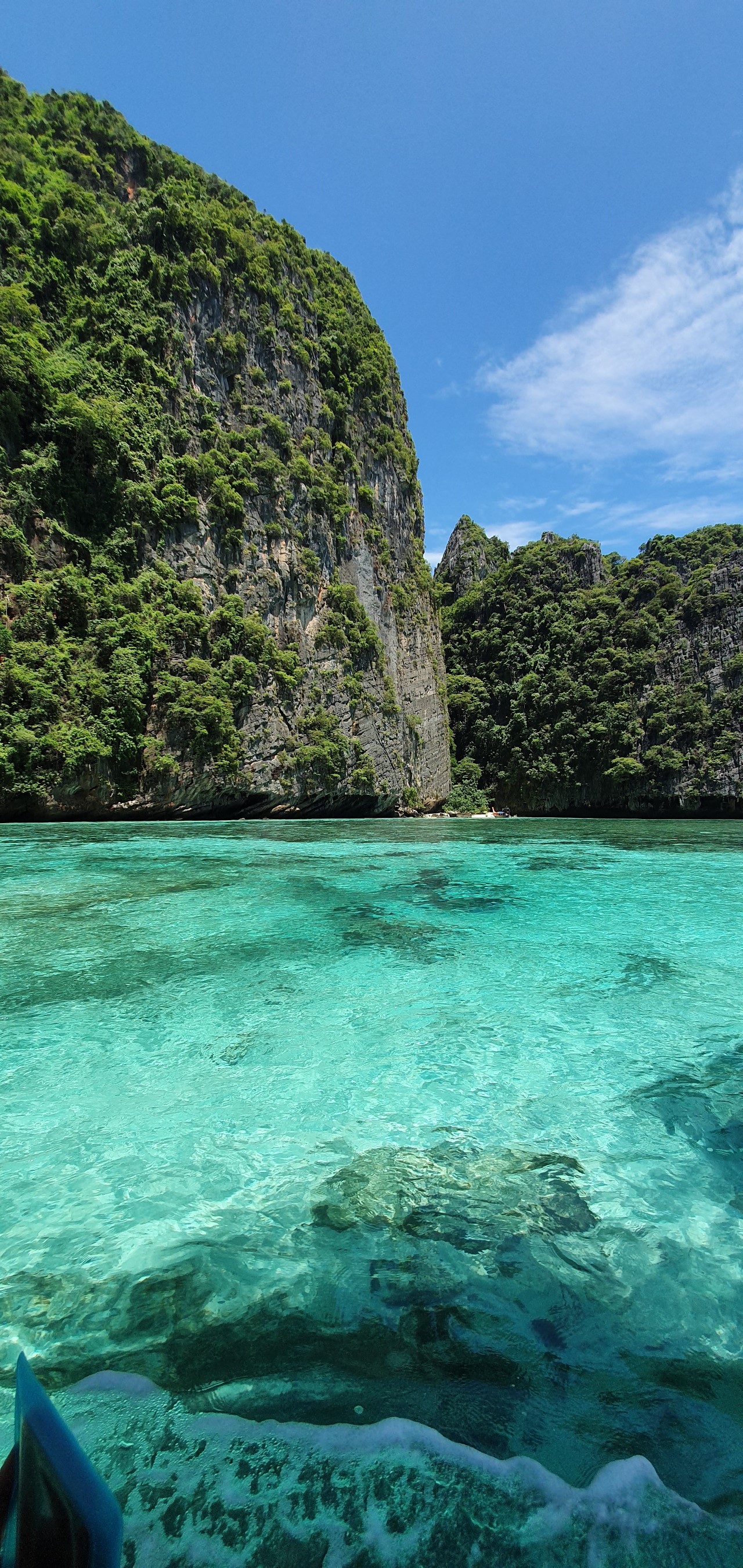 Loh Samah Bay snorkeling with reef sharks, looking at the rope ladder that leads across to The Beach on Maya Bay