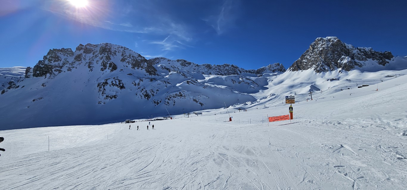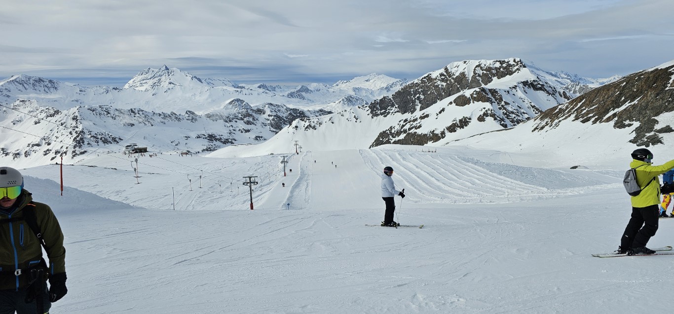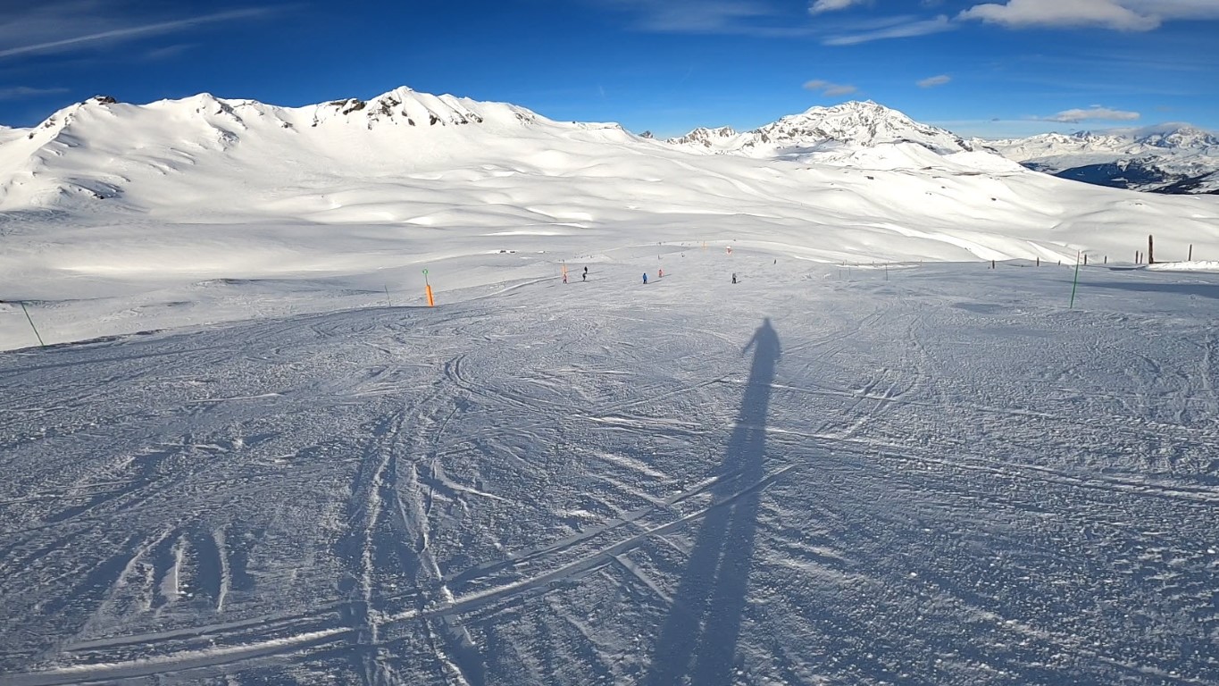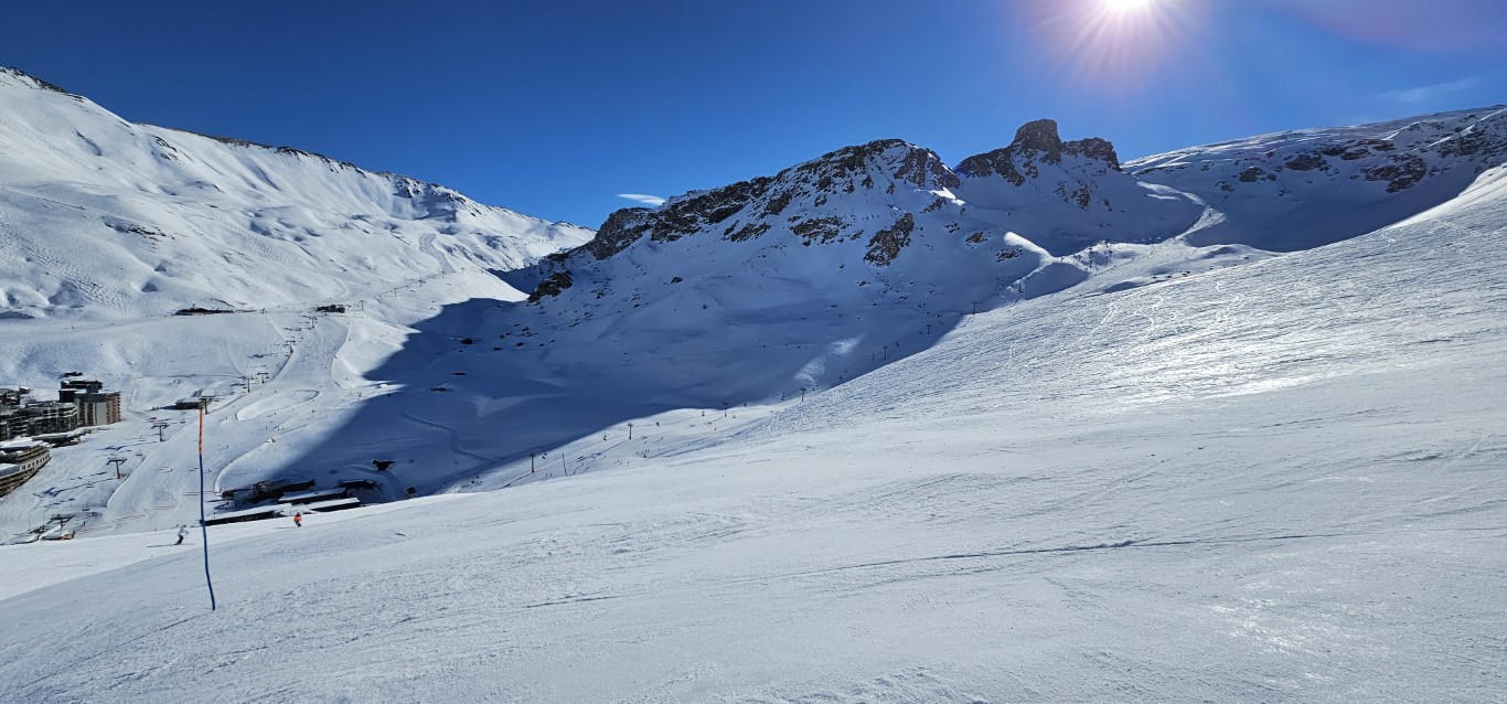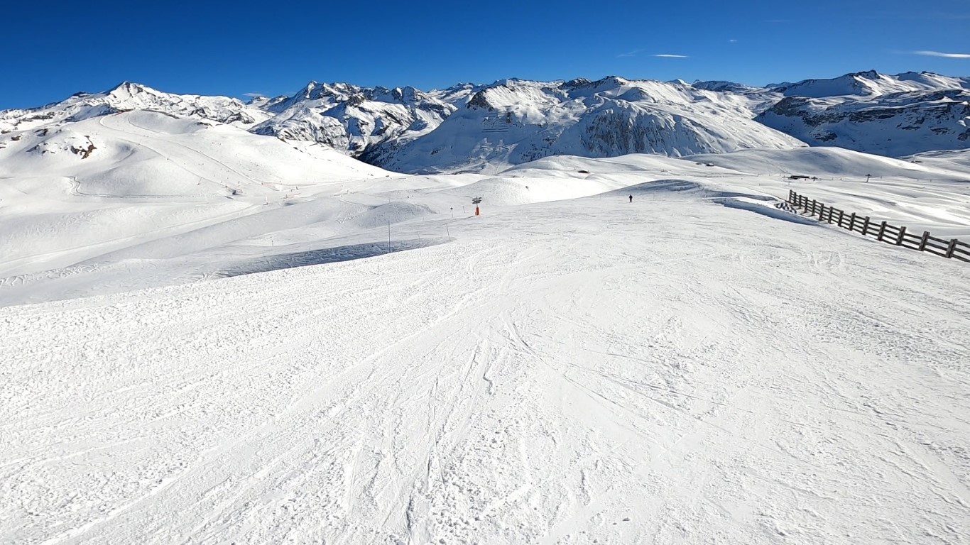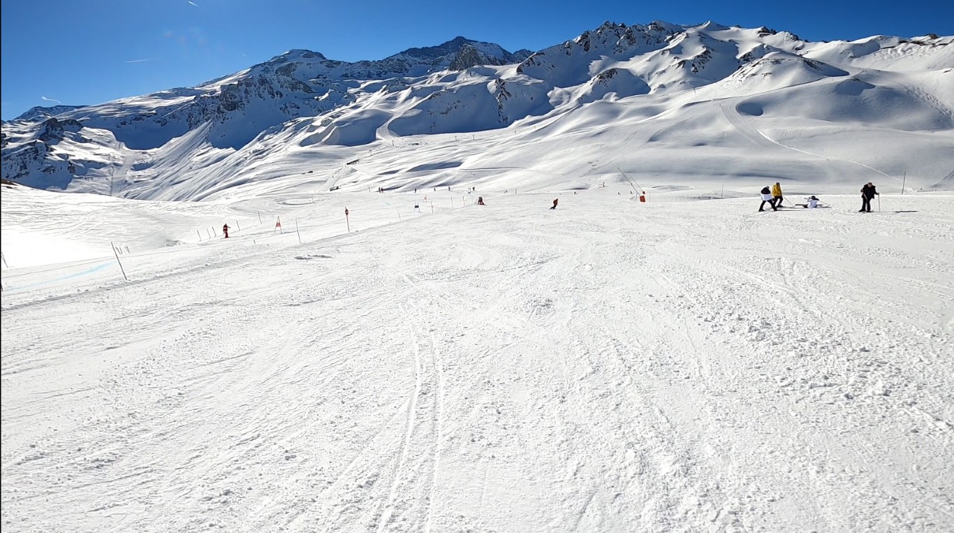 Val d’Isere has been effected by the same warm weather pattern as others in the Alps area, no fresh snow for well over a week, and yet surfaces are firm but very workable. Just the occasional ice patch lower in the runs; otherwise it was stunning sunshine and very forgiving surfaces if you stayed high, and there is plenty of top-to-bottom runs above 2000m.
