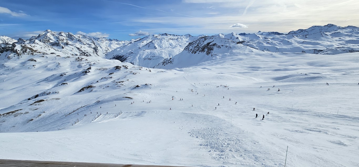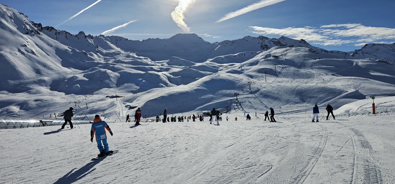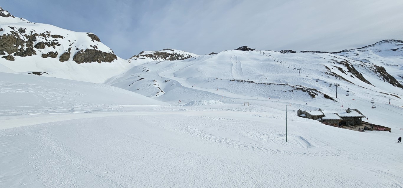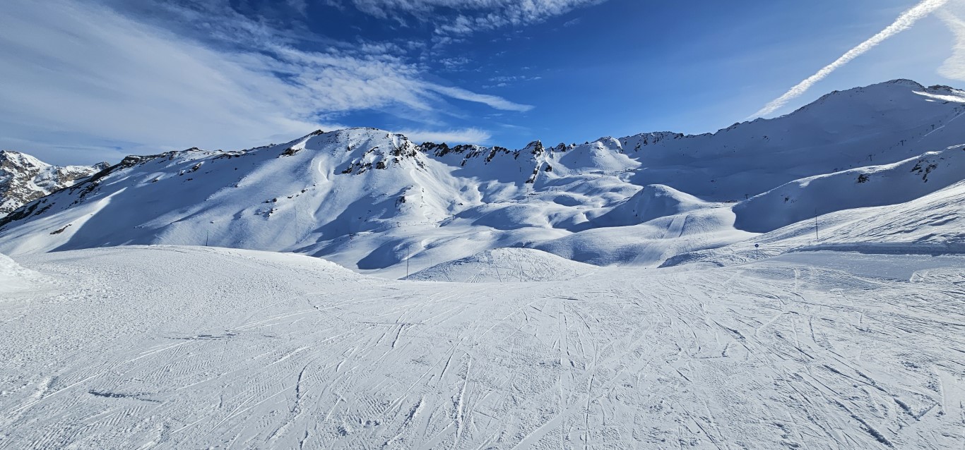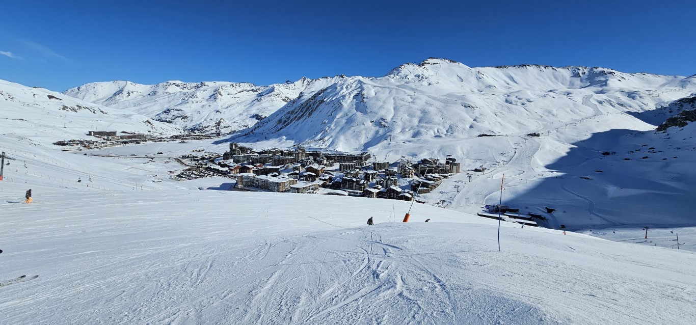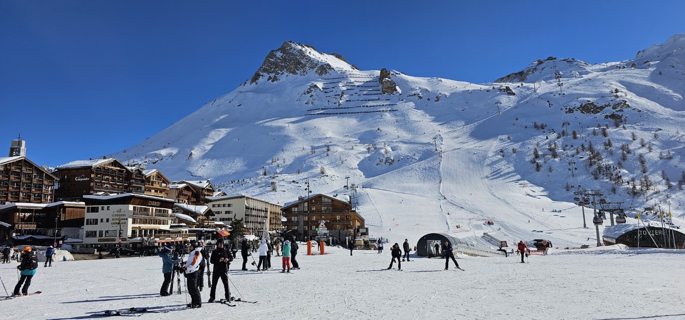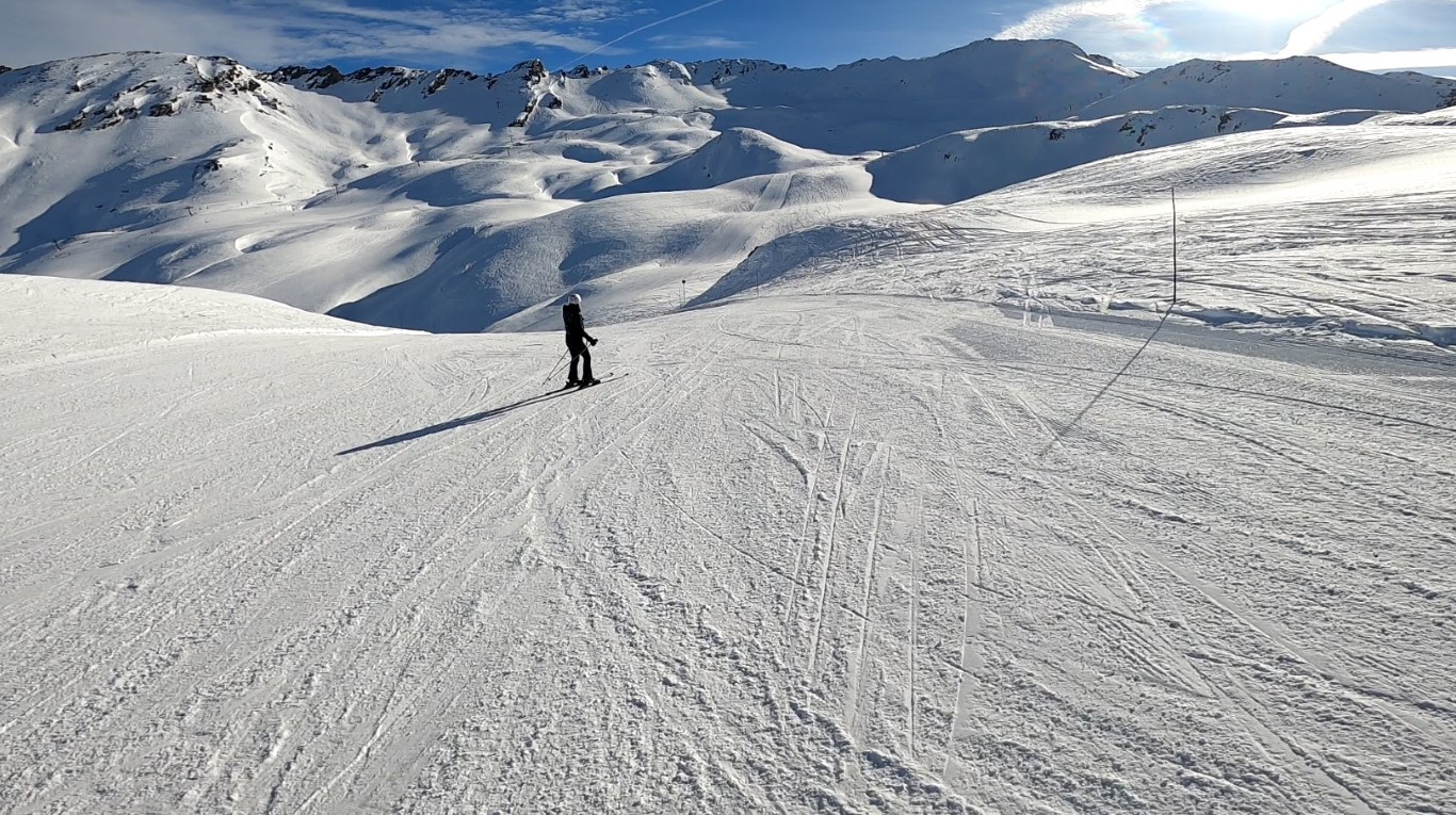 Val d’Isere has been effected by the same warm weather pattern as others in the Alps area, no fresh snow for well over a week, and yet surfaces are firm but very workable. Just the occasional ice patch lower in the runs; otherwise it was stunning sunshine and very forgiving surfaces if you stayed high, and there is plenty of top-to-bottom runs above 2000m.