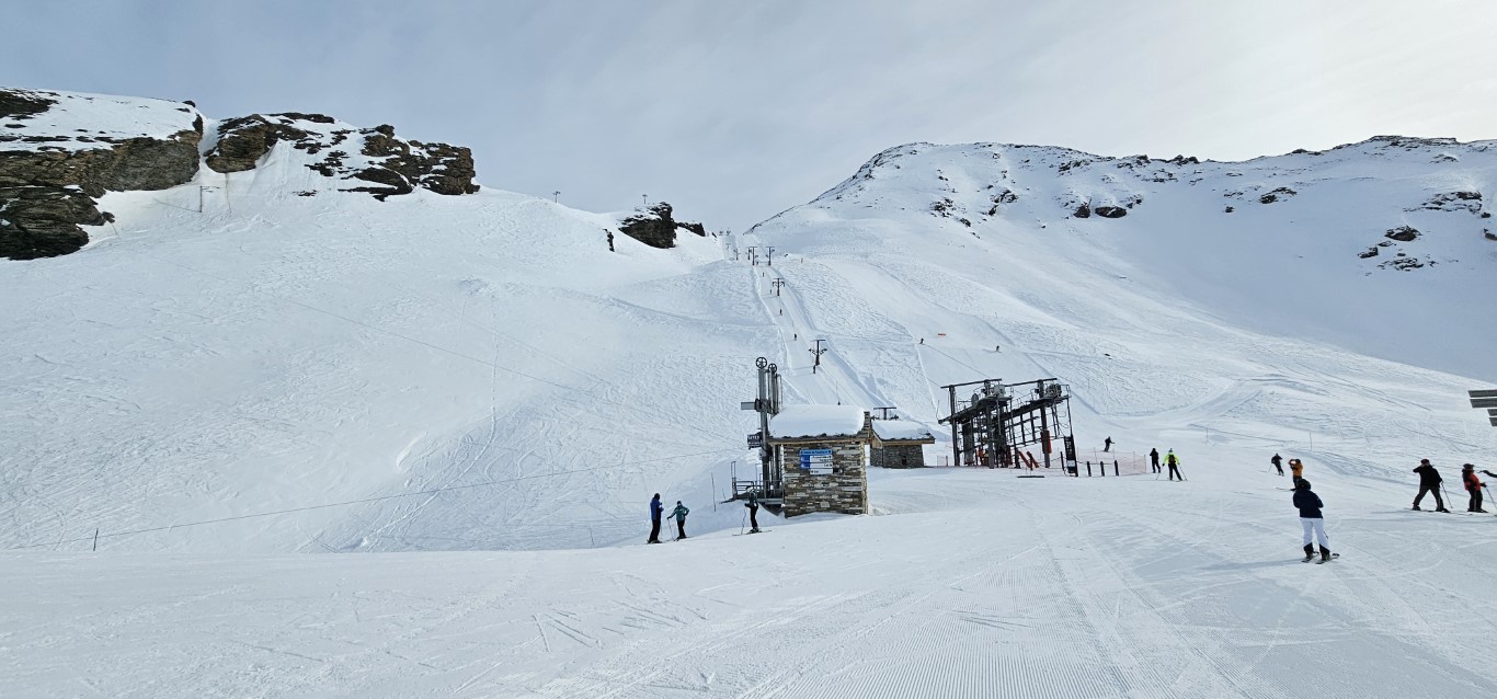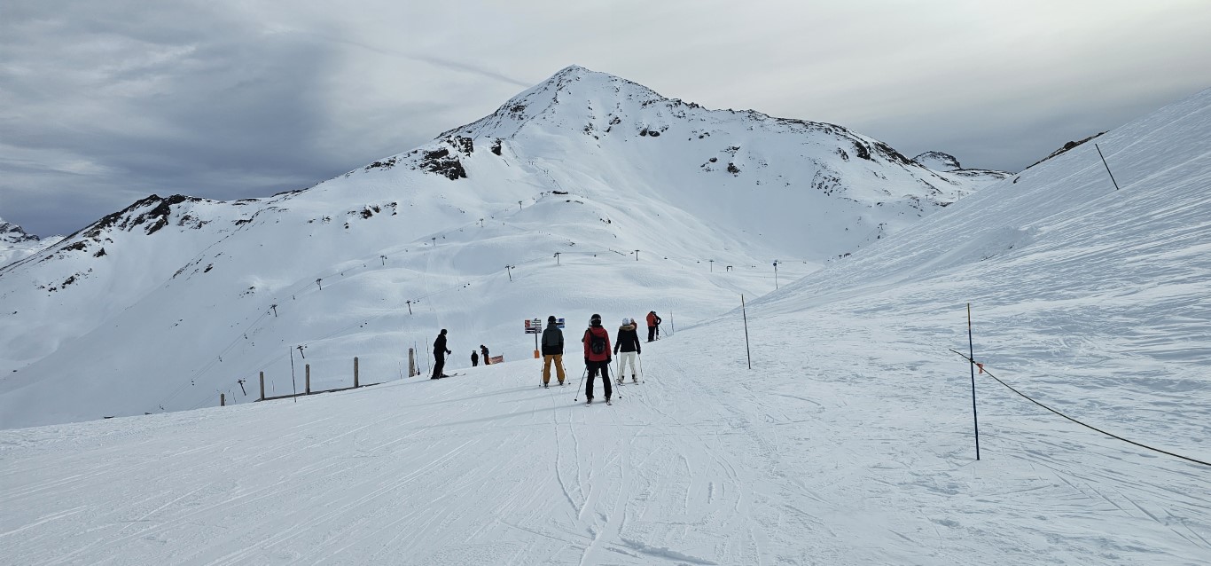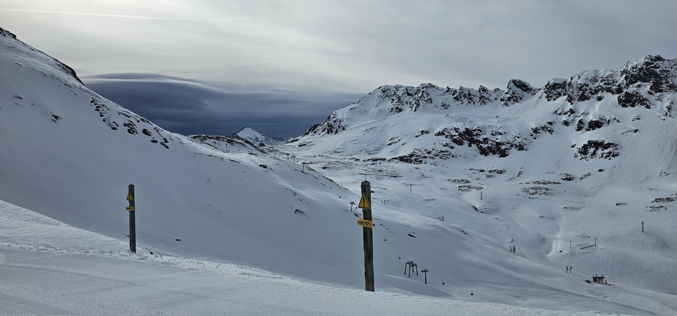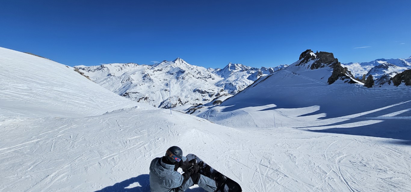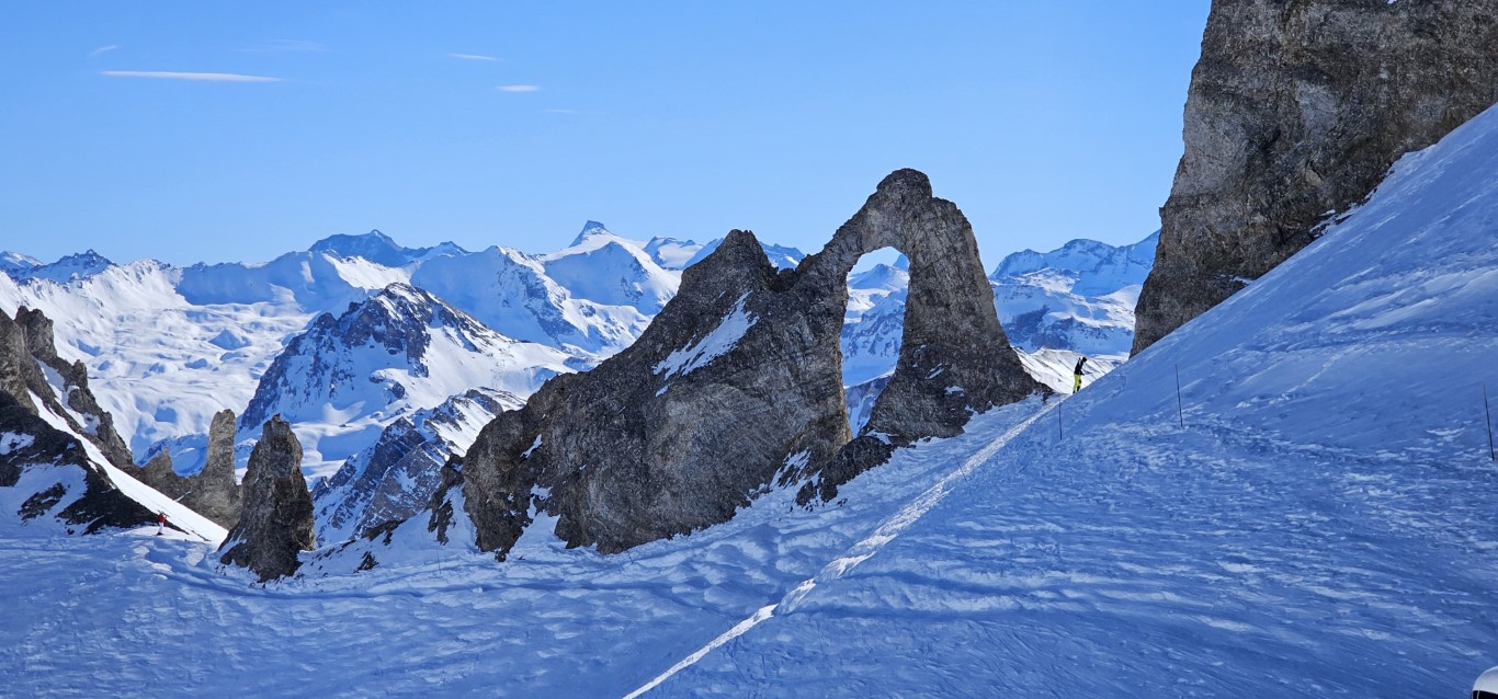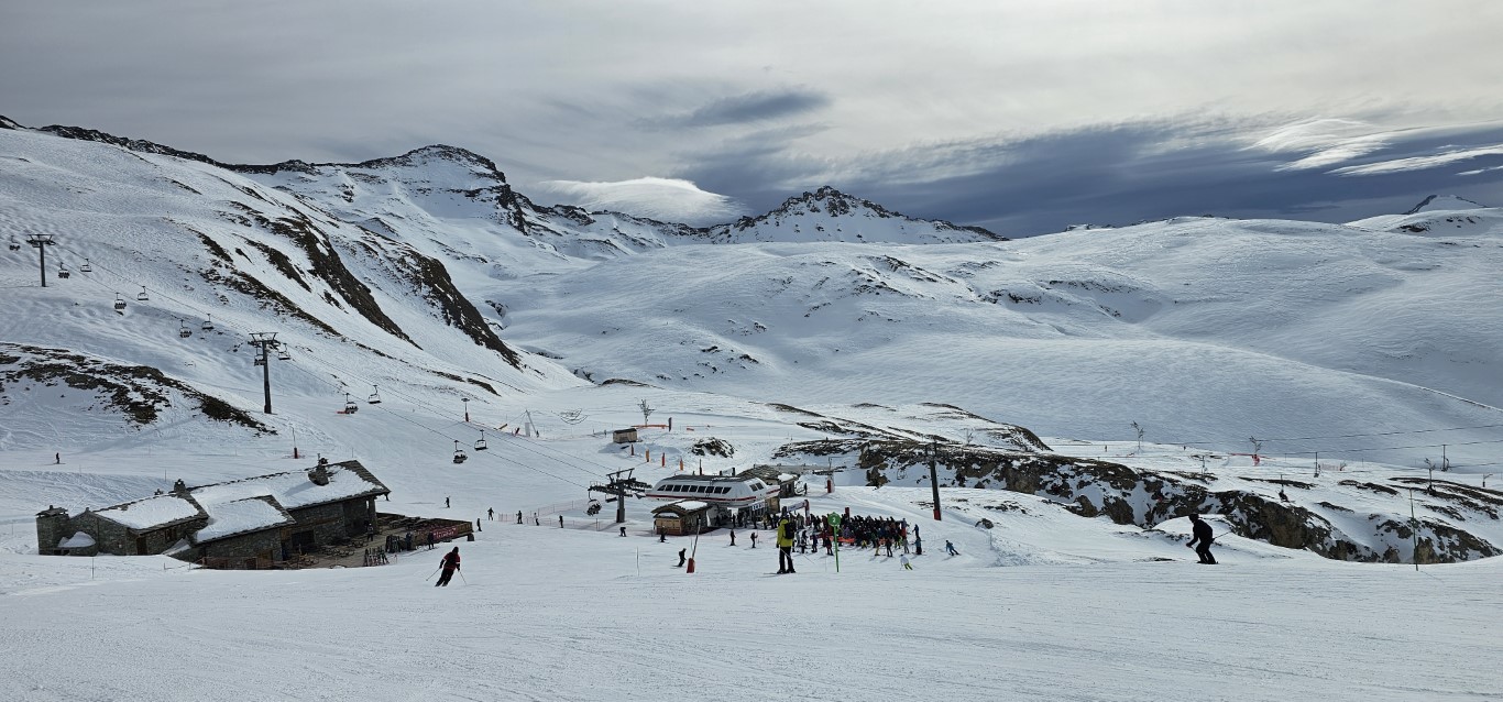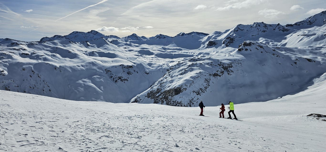 Val d’Isere has been effected by the same warm weather pattern as others in the Alps area, no fresh snow for well over a week, and yet surfaces are firm but very workable. Just the occasional ice patch lower in the runs; otherwise it was stunning sunshine and very forgiving surfaces if you stayed high, and there is plenty of top-to-bottom runs above 2000m.